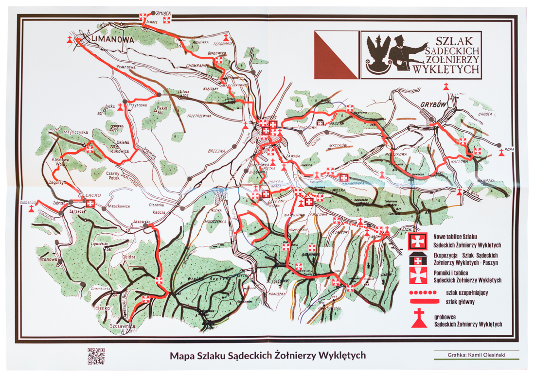 The catalogue was made along with exhibition, commemorating the Polish post-WW2, anticommunist conspiracy. The book includes the stories of the selected people as well as military units of the anti-communist underground army that was operating in the Nowy Sącz region after WW2 until 1954. This relates to 6 junction points of the Cursed Soldiers Trail: Nowy Sącz (2), Nawojowa, Kamionka Wielka, Łącko and Żeleźnikowa Wielka.